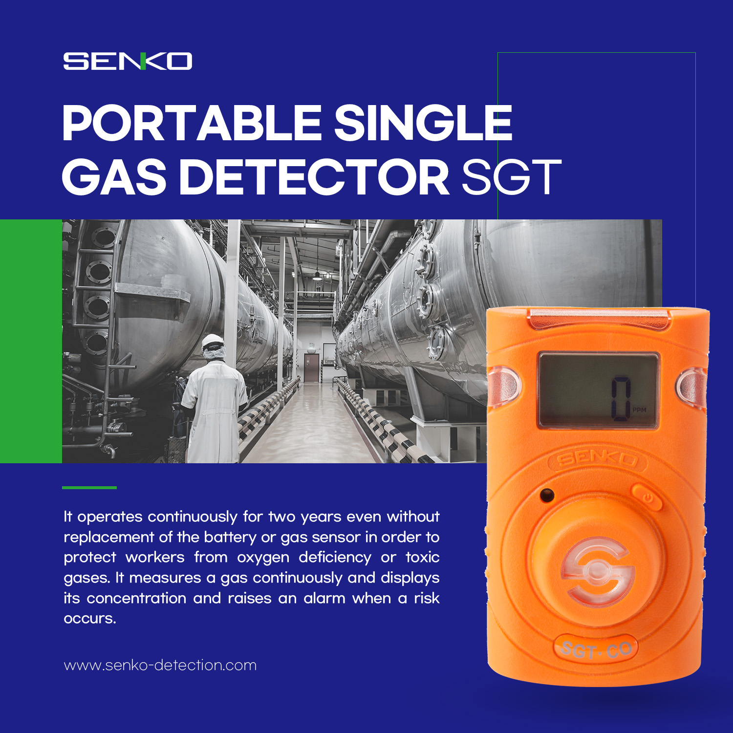 센코 SGT는 일회용 타입의 휴대용 단일가스 감지기로서, 배터니라 가스센서를 교체하지 않아도 약 2년 동안 연속 작동하며 산소결핍이나 유독가스로부터 근로자를 보호하기 위해 가스를 실시간 측정해 농도를 표시하고 위험 발생 시 경보를 발생합니다.